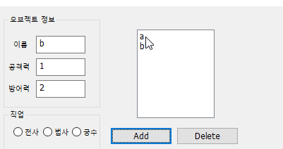 여기까지 하였으면 정보를 입력하고 Add 버튼을 눌렀을 때 다음과 같이 ListBox에 추가가 된 것을 볼 수 있다.